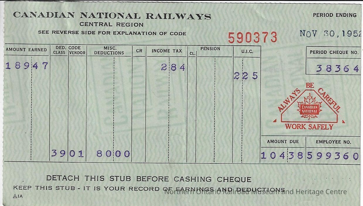 Canadian National branded statement of earnings and deductions belonging to Frank Mazzuca, for the pay period ending on November 30, 1952Creator