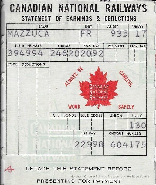 Canadian National branded statement of earnings and deductions belonging to Frank MazzucaContext