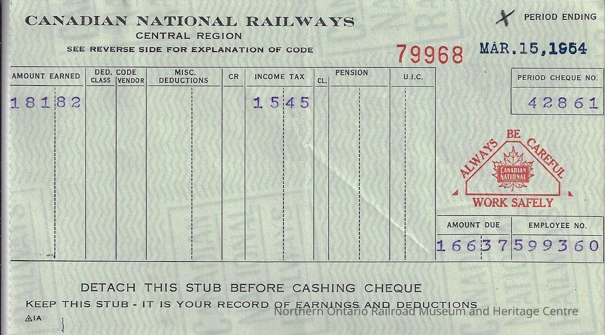 Canadian National branded statement of earnings and deductions belonging to Frank Mazzuca for the pay period ending on March 15, 1954Creator