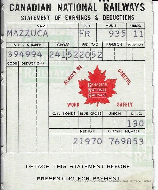 Canadian National branded statement of earnings and deductions belonging to Frank MazzucaCreator