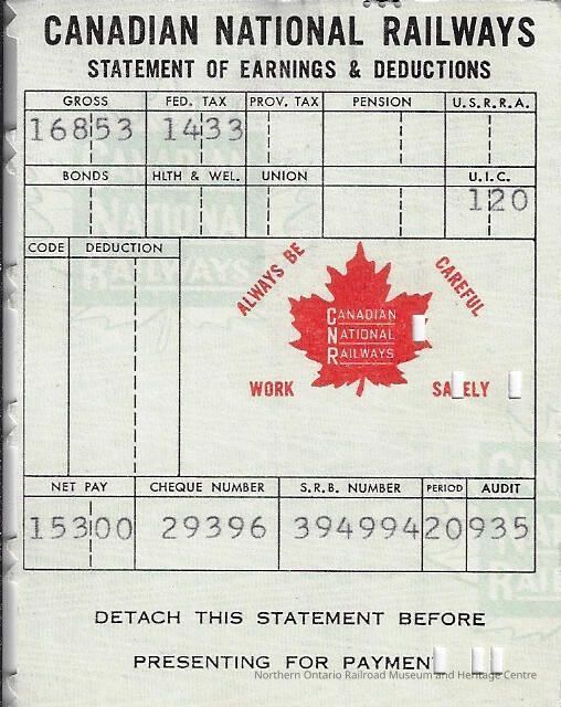 Canadian National branded statement of earnings and deductions belonging to Frank Mazzuca. The year is unknown, circa 1950sContext