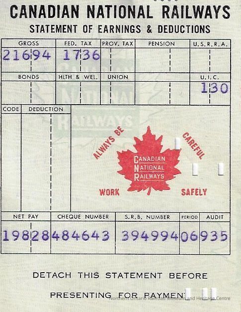 Canadian National branded statement of earnings and deductions belonging to Frank Mazzuca, year is unknown circa 1950Context