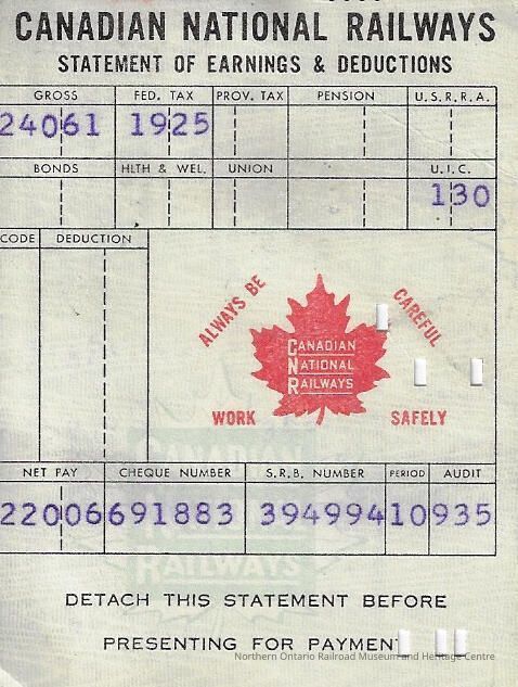 Canadian National branded statement of earnings and deductions belonging to Frank Mazzuca. The year is unknown, circa 1950sCreator