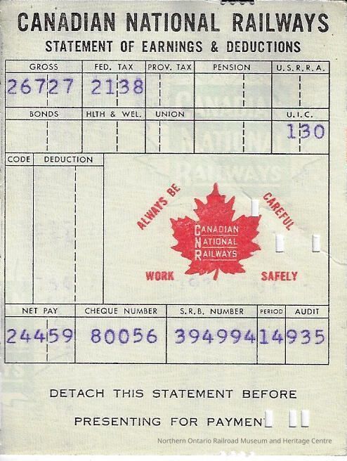 Canadian National branded statement of earnings and deductions belonging to Frank Mazzuca. The year is unknown, circa 1950sContext