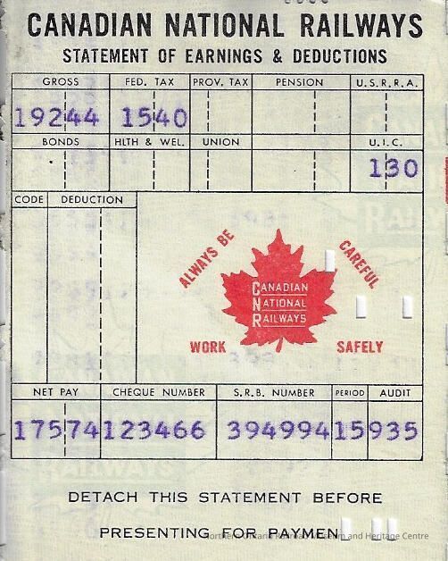 Canadian National branded statement of earnings and deductions belonging to Frank Mazzuca. The year is unknown, circa 1950sContext