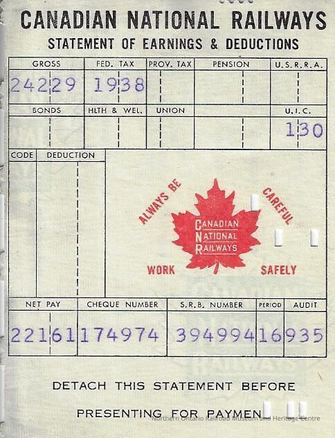 Canadian National branded statement of earnings and deductions belonging to Frank Mazzuca. The year is unknown, circa 1950sContext