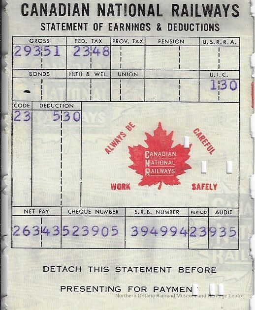 Canadian National branded statement of earnings and deductions belonging to Frank Mazzuca. The year is unknown, circa 1950sContext