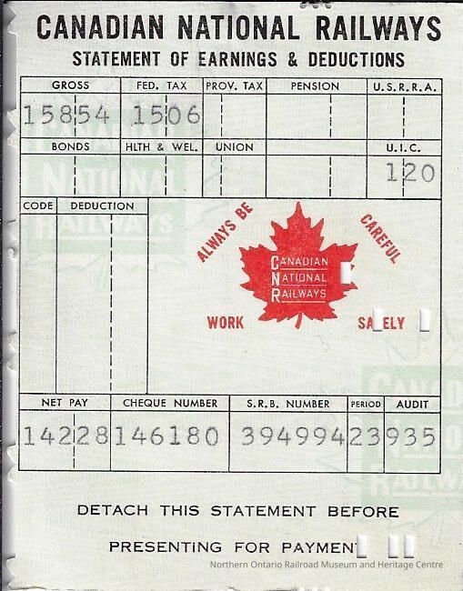 Canadian National branded statement of earnings and deductions belonging to Frank Mazzuca. The year is unknown, circa 1950sContext