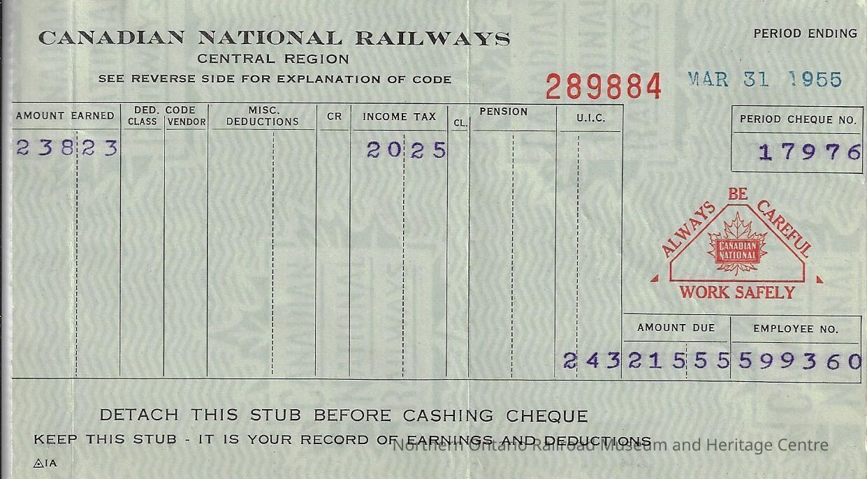 Canadian National branded statement of earnings and deductions belonging to Frank Mazzuca, for the pay period ending on March 31, 1955Creator