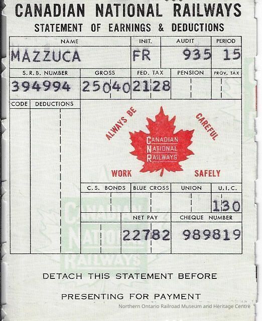 Canadian National branded statement of earnings and deductions belonging to Frank MazzucaContext