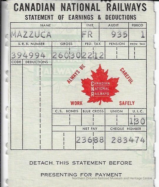 Canadian National branded statement of earnings and deductions belonging to Frank MazzucaCreator