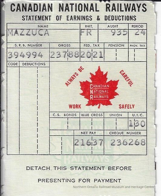 Canadian National branded statement of earnings and deductions belonging to Frank MazzucaContext
