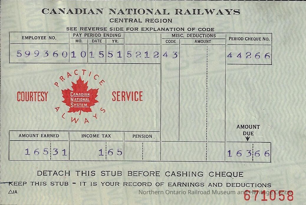 Canadian National Statement of Earnings and Deductions belonging to Frank MazzucaEntry/Object ID