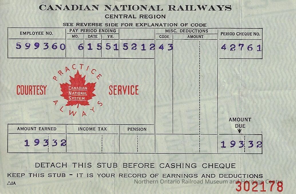 Canadian National branded statement of earnings and deductions belonging to Frank Mazzuca for the pay period ending on June 15, 1951Context