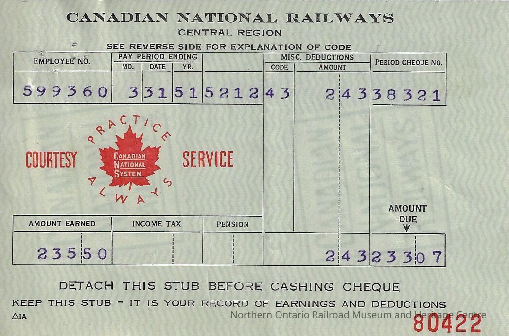 Canadian National Statement of Earnings and Deductions belonging to Frank MazzucaEntry/Object ID