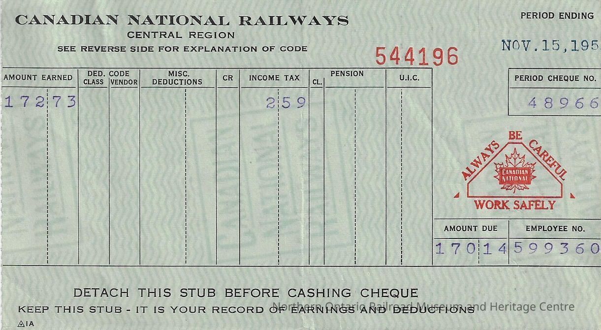 Canadian National branded statement of earnings and deductions belonging to Frank Mazzuca, for the pay period ending on November 15, 1952Creator