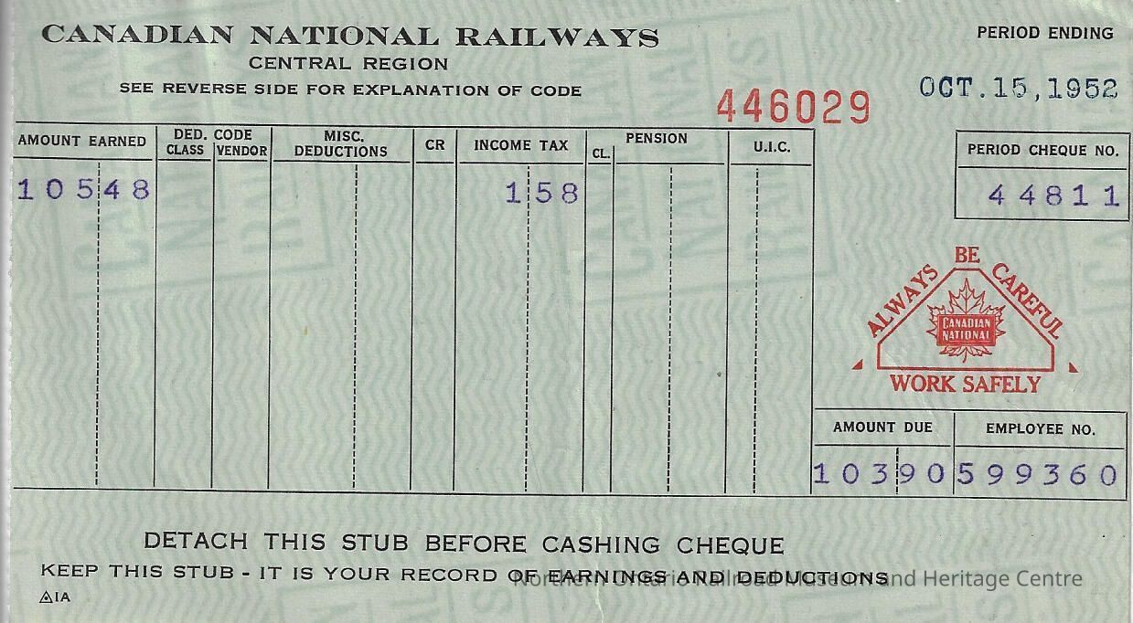 Canadian National branded statement of earnings and deductions belonging to Frank Mazzuca, for the pay period ending on October 15, 1952Creator