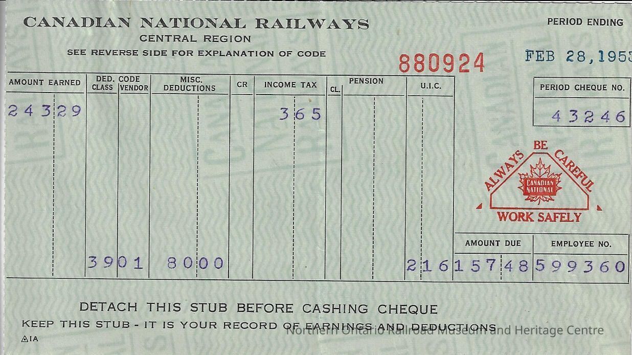 Canadian National branded statement of earnings and deductions belonging to Frank Mazzuca for the pay period ending on February 28, 1953Context