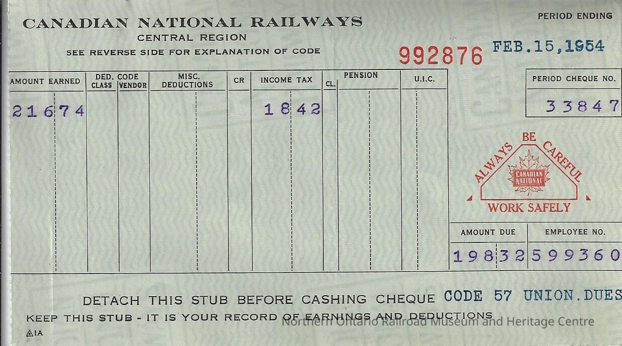 Canadian National branded statement of earnings and deductions belonging to Frank Mazzuca for the pay period ending on February 15, 1954Context