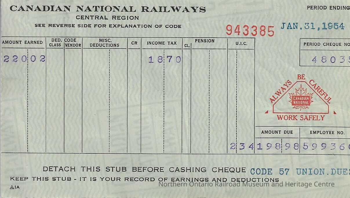 Canadian National branded statement of earnings and deductions belonging to Frank Mazzuca, for the pay period ending on January 31, 1954Context