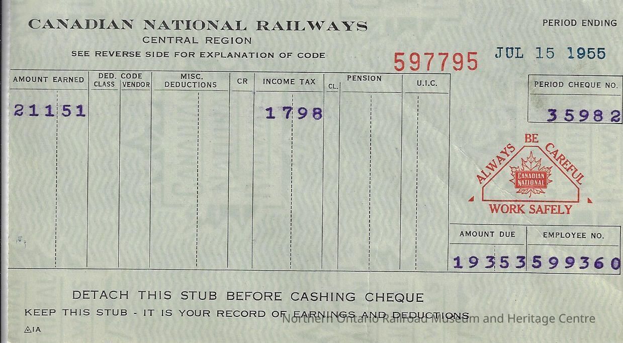 Canadian National branded statement of earnings and deductions belonging to Frank Mazzuca for the pay period ending on July 15, 1955Creator