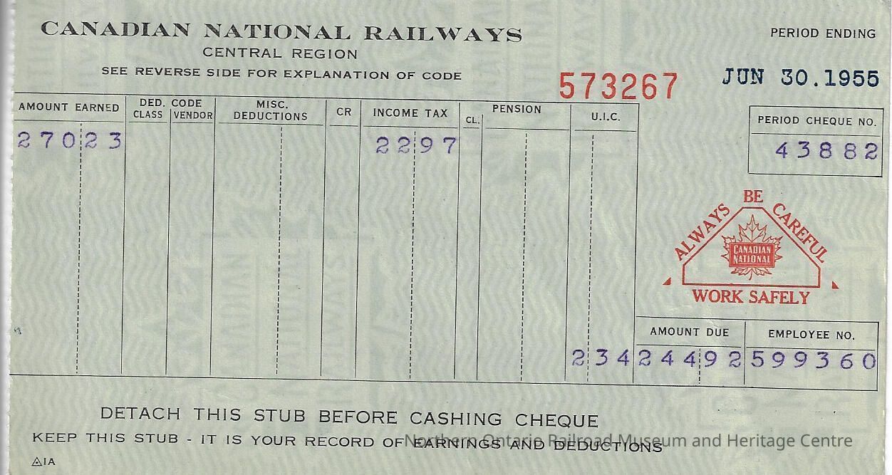 Canadian National branded statement of earnings and deductions belonging to Frank Mazzuca, for the pay period ending on June 30, 1955.Creator