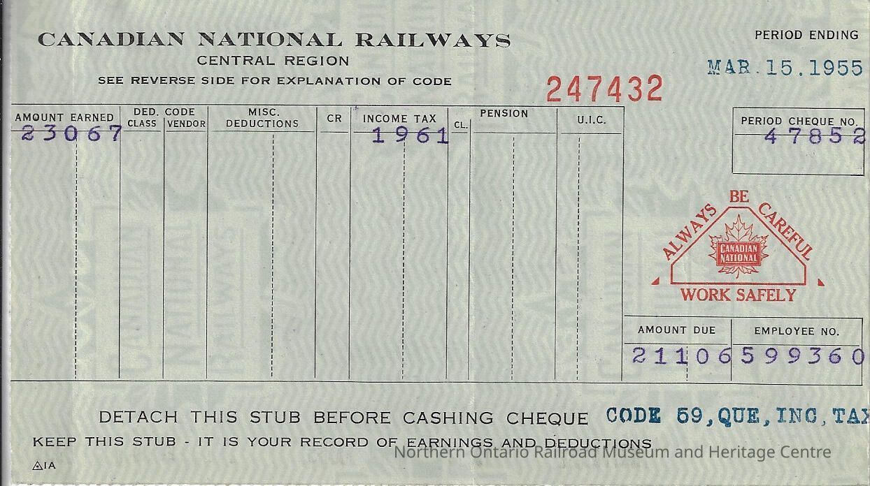 Canadian National branded statement of earnings and deductions belonging to Frank Mazzuca, for the pay period ending on March 15, 1955Creator
