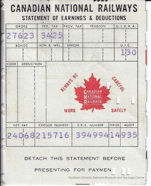 Canadian National branded statement of earnings and deductions belonging to Frank Mazzuca, the exact date is unknown, however it was issued for a pay period during the 1959 year.Context