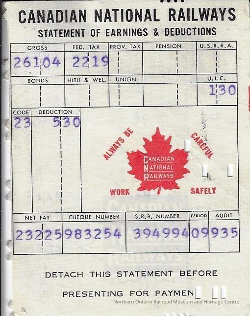 Canadian National branded statement of earnings and deductions belonging to Frank Mazzuca, the exact date is unknown, however it was issued for a pay period during the 1959 yearCreator