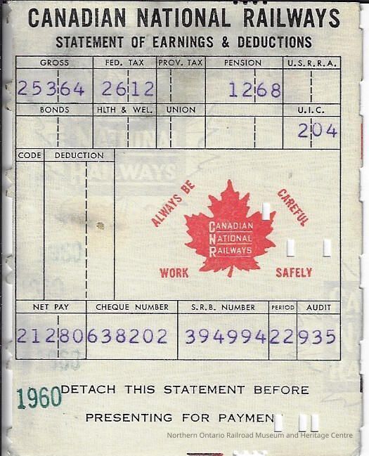 Canadian National branded statement of earnings and deductions belonging to Frank Mazzuca, the exact date is unknown, however it was issued for a pay period during the 1960 year.Context