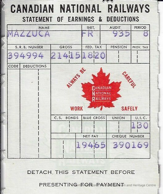 Canadian National branded statement of earnings and deductions belonging to Frank MazzucaContext