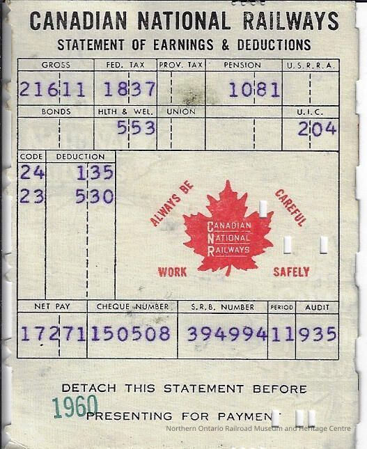 Canadian National branded statement of earnings and deductions belonging to Frank Mazzuca, the exact date is unknown, however it was issued for a pay period during the 1960 year.Context