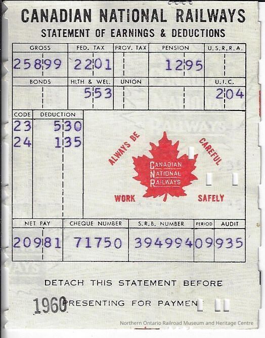 Canadian National branded statement of earnings and deductions belonging to Frank Mazzuca, the exact year is unknown, however it was issued for a pay period during the 1960 yearCreator