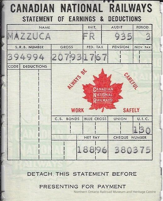 Canadian National branded statement of earnings and deductions belonging to Frank MazzucaContext