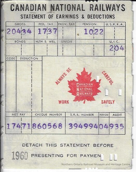 Canadian National branded statement of earnings and deductions belonging to Frank Mazzuca, the exact year is unknown however it was issued for a pay period during the 1960 year.Context