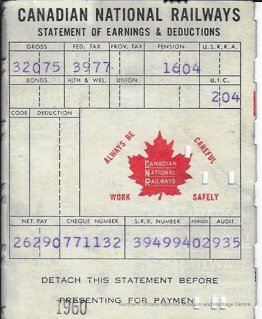 Canadian National branded statement of earnings and deductions belonging to Frank Mazzuca, the exact year is unknown however it was issued for a pay period during the 1960 yearContext