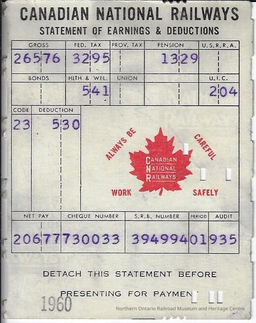 Canadian National branded statement of earnings and deductions belonging to Frank Mazzuca, the exact date is unknown, however it was issued for a pay period during the 1960 yearContext