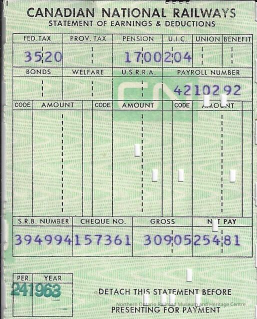 Canadian National branded statement of earnings and deductions belonging to Frank Mazzuca, the exact year is unknown however it was issued for the 24th pay period in 1963Context