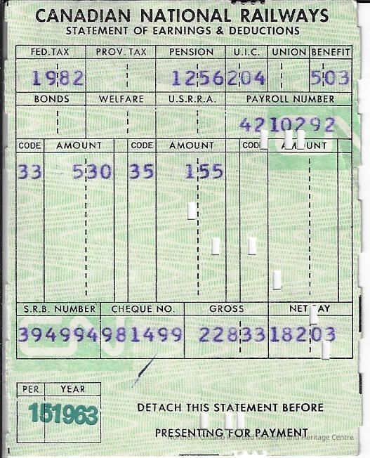 Canadian National branded statement of earnings and deductions belonging to Frank Mazzuca, the exact date is unknown however it was issued on the 15th pay period in 1963Context