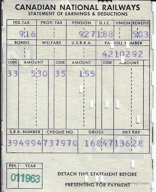 Canadian National branded statement of earnings and deductions belonging to Frank Mazzuca, the exact date is unknown however it was issued during the 1st pay period of 1963Creator