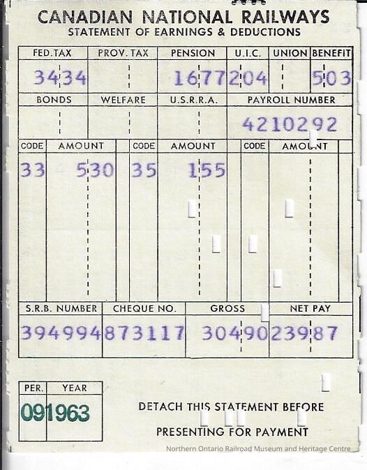 Canadian National branded statement of earnings and deductions belonging to Frank Mazzuca, the exact date is unknown however it was issued for the 9th pay period in 1963Creator