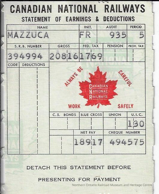 Canadian National branded statement of earnings and deductions belonging to Frank MazzucaContext