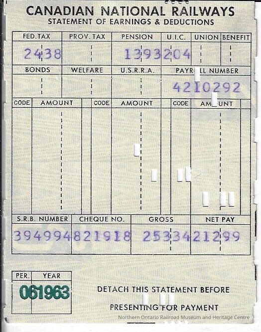 Canadian National branded statement of earnings and deductions belonging to Frank Mazzuca, the exact date is unknown however it was issued for the 6th pay period of 1963Creator