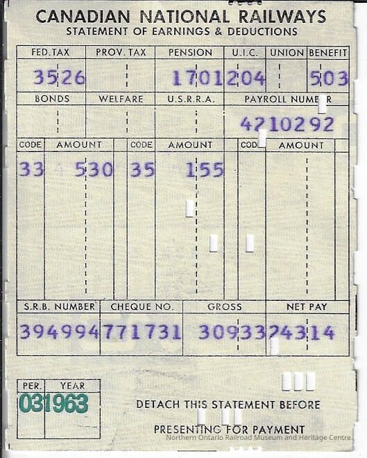 Canadian National branded statement of earnings and deductions belonging to Frank Mazzuca, the exact date is unknown however it was issued during the 3rd pay period of 1963Context