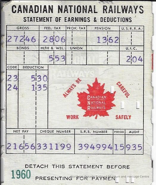 Canadian National branded statement of earnings and deductions belonging to Frank Mazzuca, the exact date is unknown however it was issued for a pay period during the 1960 year.Context
