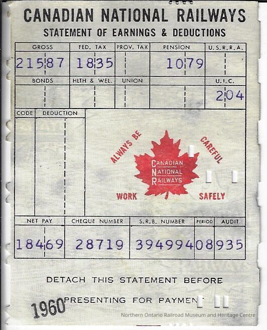 Canadian National branded statement of earnings and deductions belonging to Frank Mazzuca, the exact date is unknown, however it was issued for a pay period during the 1960 yearContext