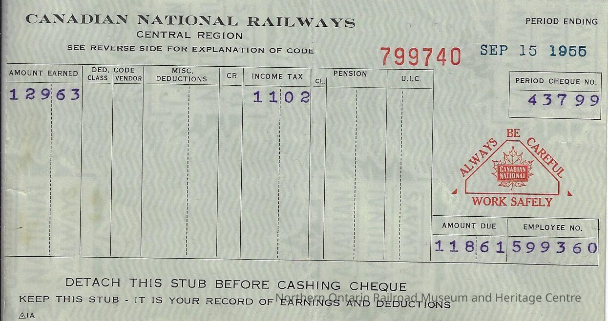 Canadian National branded statement of earnings and deductions belonging to Frank Mazzuca for the pay period ending on September 15, 1955Creator