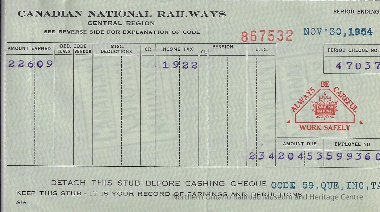 Canadian National branded statement of earnings and deductions belonging to Frank Mazzuca for the pay period ending on November 30, 1954Creator