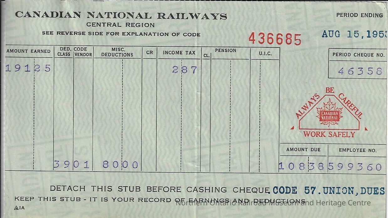 Canadian National statement of earnings and deductions belonging to Frank Mazzuca for the pay period ending on August 15, 1953Context