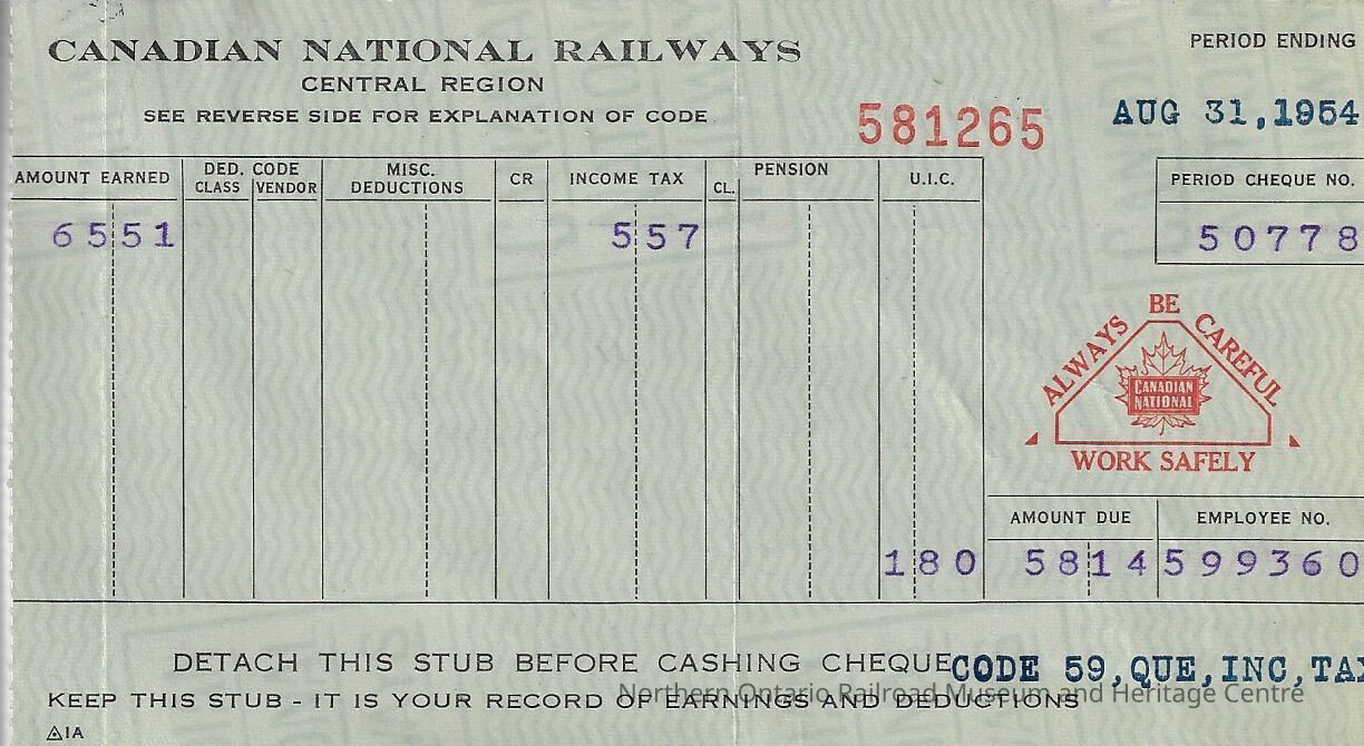 Canadian National branded statement of earnings and deductions belonging to Frank Mazzuca, for the pay period ending on August 31, 1954Context